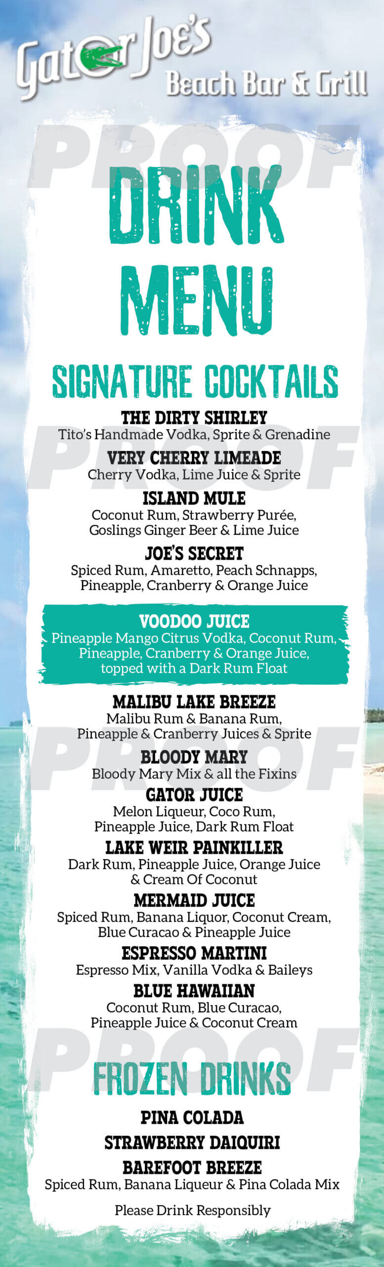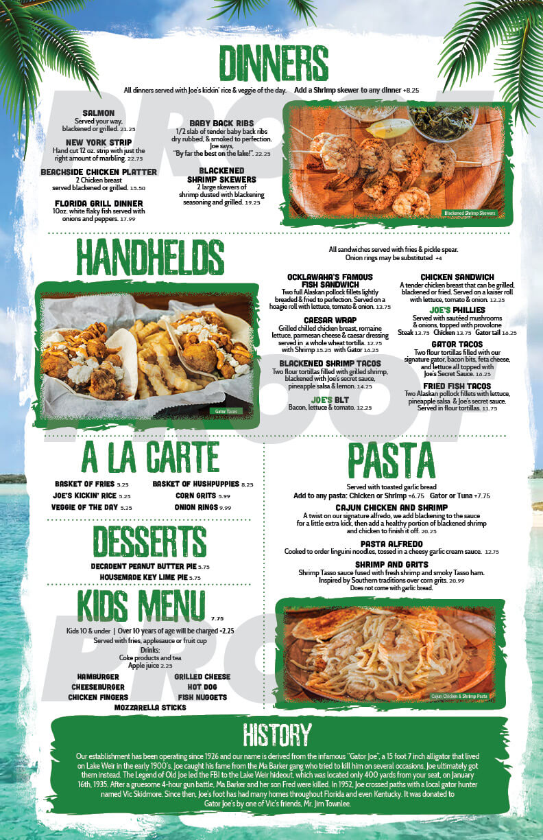 Gator Joe’s features Burgers, Sandwiches, Seafood & Steakhouse Cuisine.